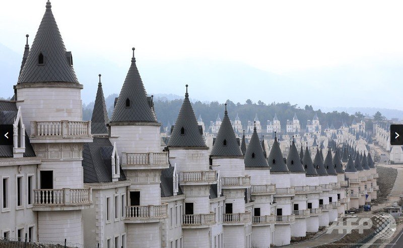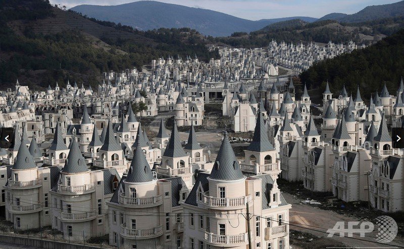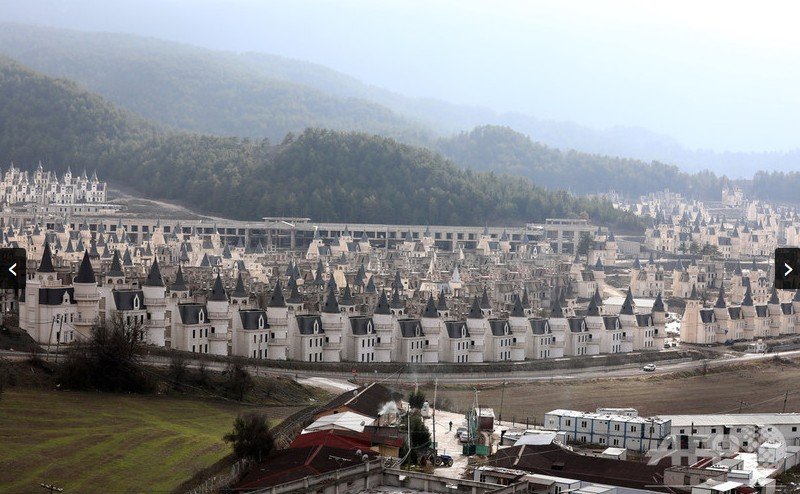 ・ トルコ北西部の田舎町に整然と立ち並ぶ数百棟の高級住宅。先のとがった屋根は、フランスの古城かディズニーの城と言ったところか。まるで蜃気楼のようにも見える。