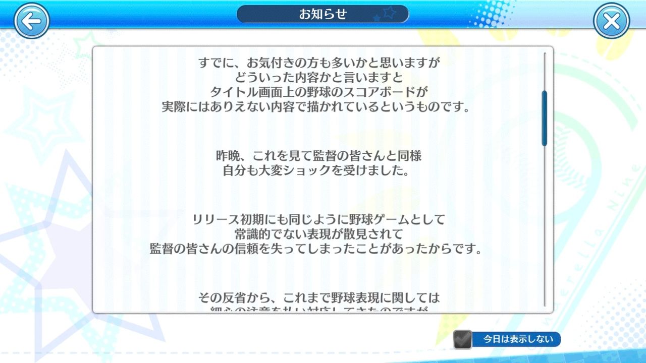 【ハチナイ】タイトル画面スコアボードの件で山口Pが謝罪の手紙「大変ショック」