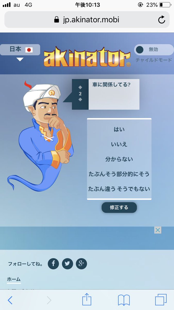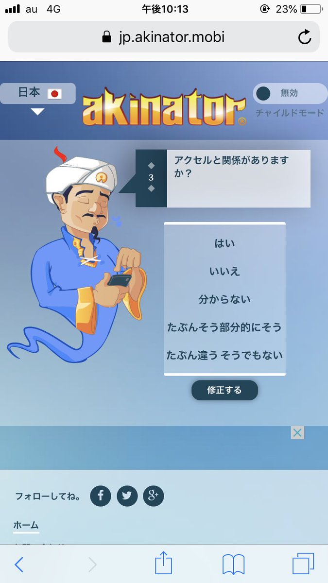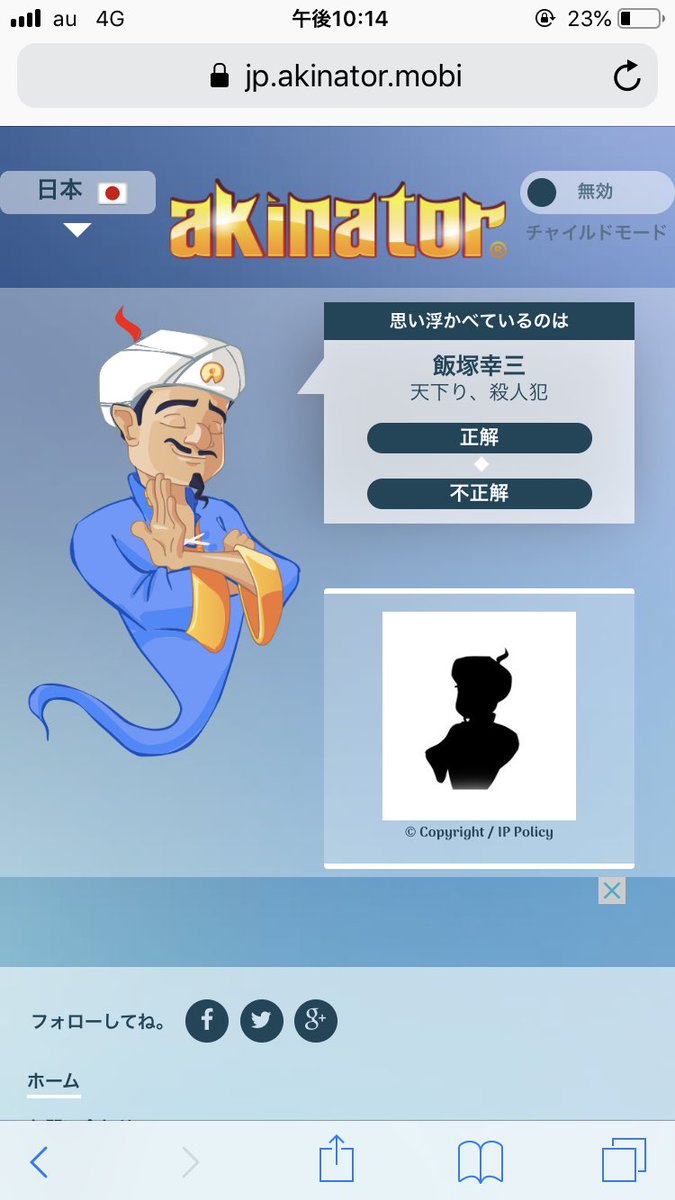 ネットで見た、今アキネイターやると飯塚幸三に関連する質問がすぐ飛んでくる っての本当で笑った pic.twitter.com/A1JOvup9wC