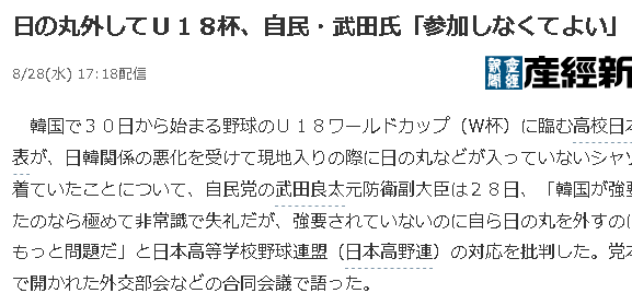 ・自民党の武田良太元防衛副大臣は「韓国が強要したのなら極めて非常識で失礼だが、強要されていないのに自ら日の丸を外すのはもっと問題だ」と日本高等学校野球連盟(日本高野連)の対応を批判