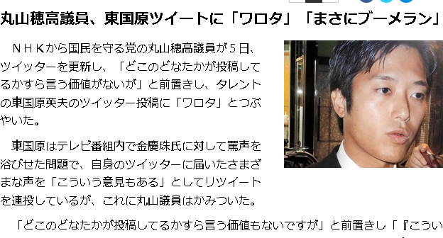 ・NHKから国民を守る党の丸山穂高議員が5日、ツイッターを更新し、「どこのどなたかが投稿してるかすら言う価値がないが」と前置きし、タレントの東国原英夫のツイッター投稿に「ワロタ」とつぶやいた