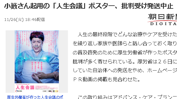 ・全国がん患者団体連合会の天野慎介理事長はフェイスブックに「これでは人生会議というよりは、死に方会議のポスターです。自分は死ぬとは思ってない人が考えたポスターではないでしょうか」と書き込んだ