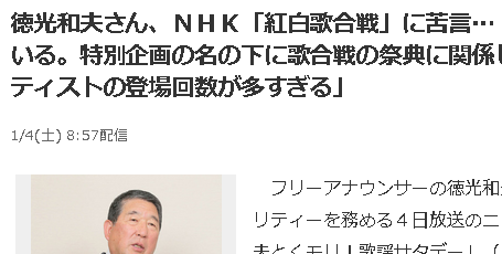 徳光和夫さん、NHK「紅白歌合戦」に苦言…「原点を失っている。特別企画の名の下に歌合戦の祭典に関係しない形のアーティストの登場回数が多すぎる」