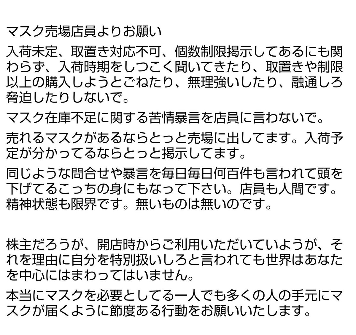 マスクが手に入らない憤りは分かりますが、現在のマスク品薄状態に売場の人間が出来ることはほとんどないのです。店員はあなたのストレス発散のはけ口でもサンドバッグでもありません。地域柄もあるのかもしれませんが店員も人間で精神的に限界なのです。ご配慮下さい。 pic.twitter.com/sFvcOU1xNM