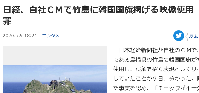 日経、自社CMで竹島に韓国国旗掲げる映像使用 削除し謝罪