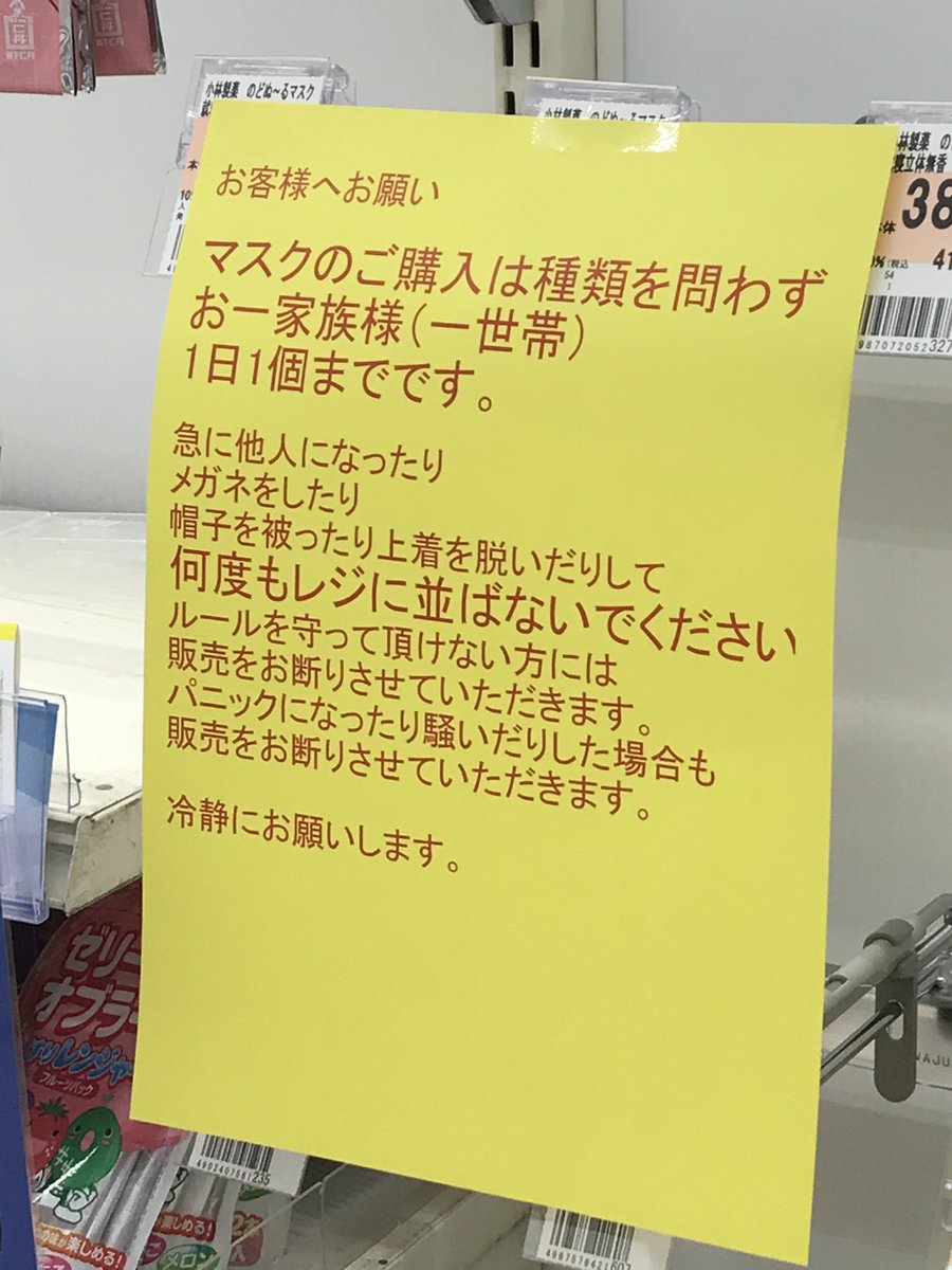 マスクの棚がやけに黄色いな-、と思ったら、↓何枚も貼ってあった🤣