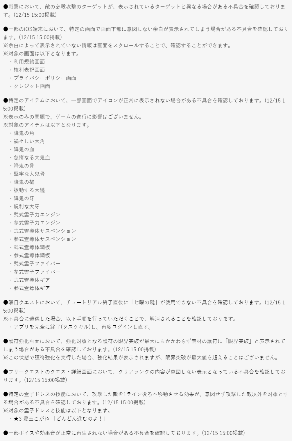 現在調査対応中の不具合(12月17日現在)