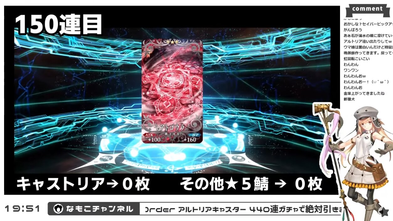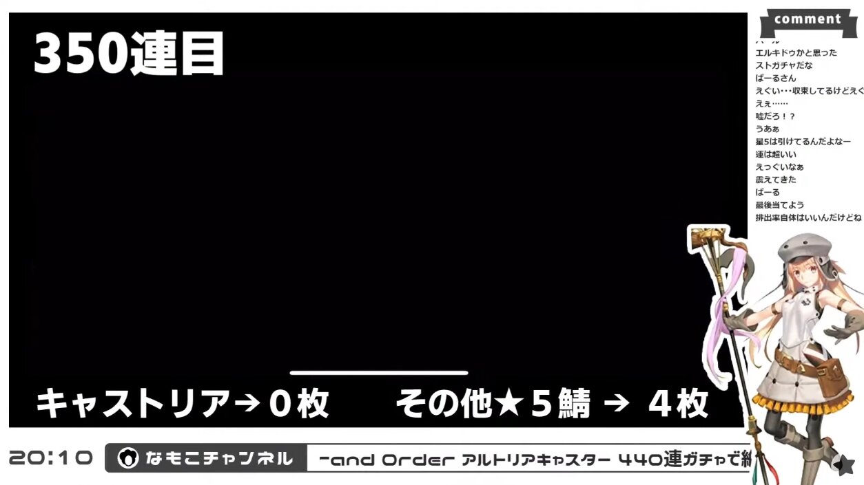 700人もの視聴者様に見守られて行った、FGOキャスターアルトリア474連ガチャ(11連換算で521連ガチャ)ですが、1枚も引く事が出来ず終わりました。。