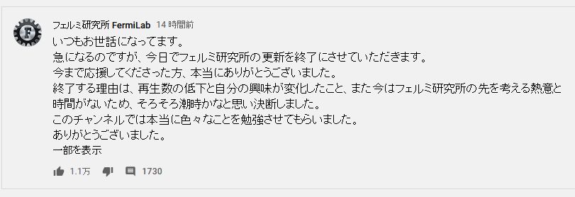 7月16日、「フェルミ研究所」(登録者数213万人)が活動終了を発表しました。
