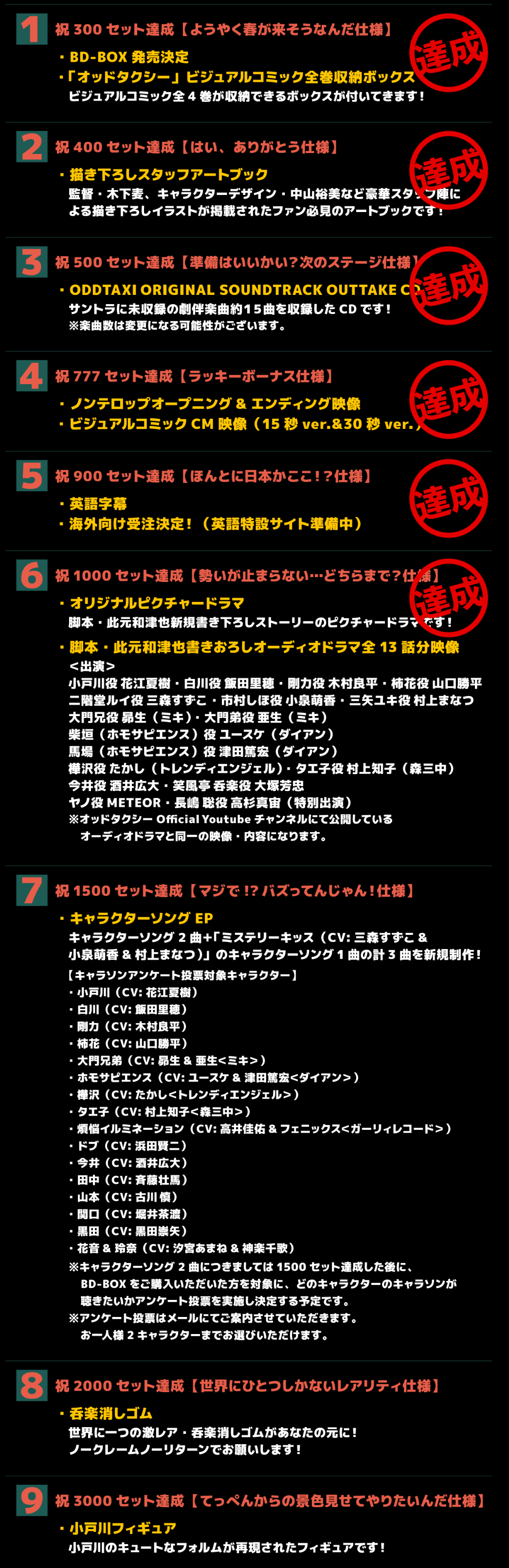 Blu-rayBOXプロジェクト、最終受注セットは6038本でした。3000になったらこの絵をあげようと思っていたのですが、この数字は完全に想定外でした。たくさんのご予約、誠にありがとうございました。一同から心より御礼申し上げます。#オッドタクシー #oddtaxi pic.twitter.com/CAwY8DxCl3
