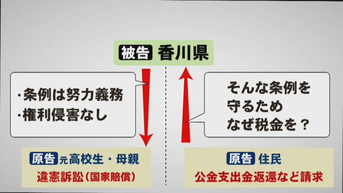 ・2つの裁判ともに代理人を務める作花知志弁護士によると、元高校生と母親が原告の違憲訴訟で、被告の香川県は「条例は努力義務であり、権利の侵害はない」と主張しています。
