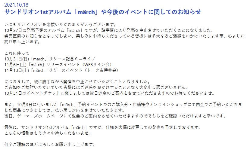 ・サンドリオンのアルバムも発売見合わせちゃったしかわいそう