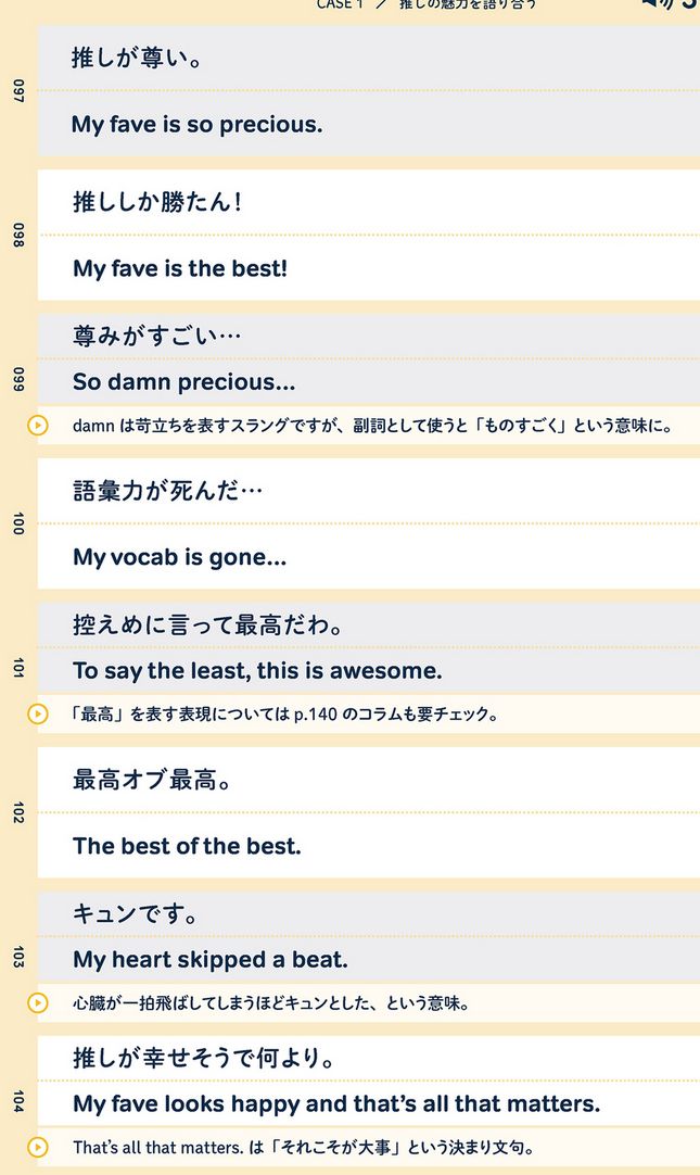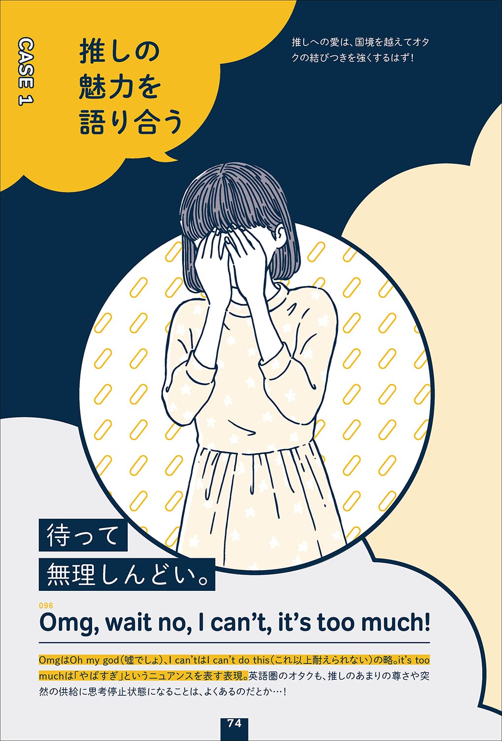 「待って無理しんどい」は、英語で"Omg, wait no, I can't, It's too much!" 界隈問わずに使える330語/477フレーズの英訳を収録。悠木碧さんによる日本語音声パートも付属 pic.twitter.com/mZWQueWJkm