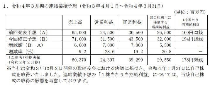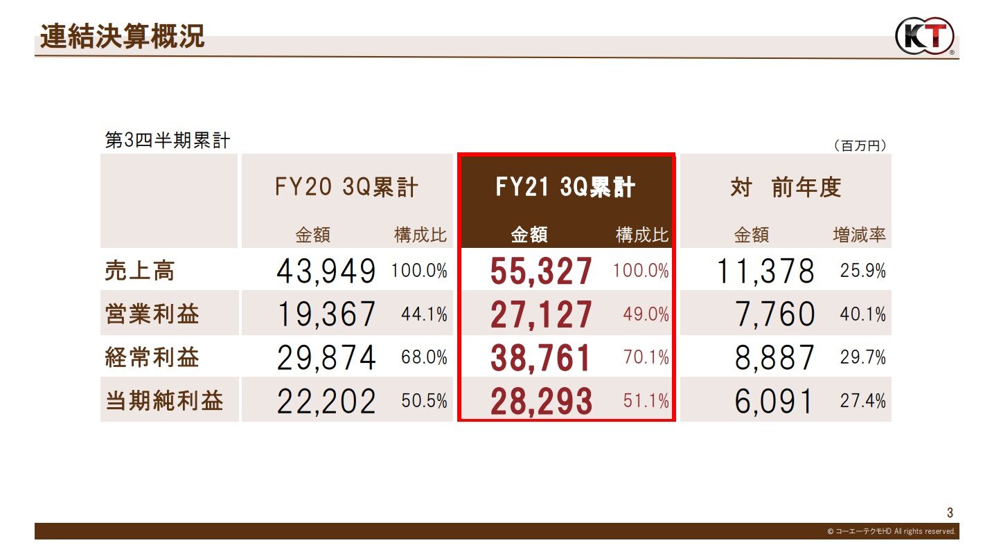 これらの結果により、売上高553億27百万円(前年同四半期比25.9%増)、営業利益271億27百万円(同40.1%増)、経常利益387億61百万円(同29.7%増)、親会社株主に帰属する四半期純利益282億93百万円(同27.4%増)となり、売上高、営業利益、経常利益、四半期純利益ともに、第3四半期連結累計期間として最高の業績を達成し、営業利益、経常利益、四半期純利益は2021年4月に公表した通期業績予想を上回る成績となりました。
