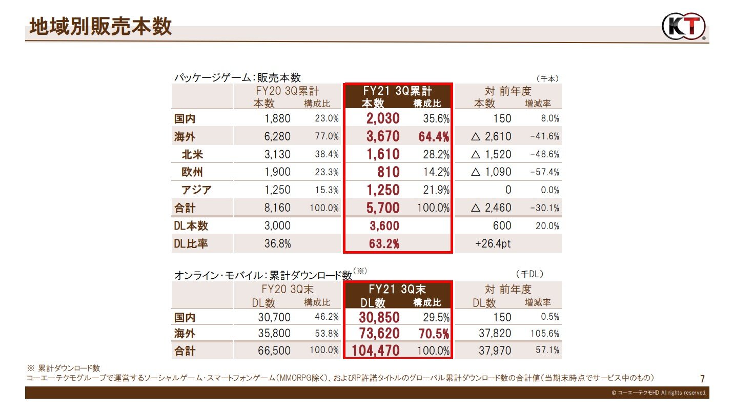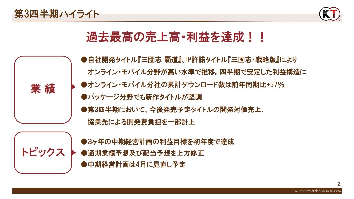 当第3四半期は、パッケージゲームでは、複数の新作やリマスター版を発売しました。スマートフォンゲームでは、自社開発タイトルの運営収入が堅調に推移しました。IP許諾によるロイヤリティ収入は引き続き高い水準です。10月には、当社代表取締役社長の襟川陽一が「シブサワ・コウ」として初めて手がけた『川中島の合戦』の発売から40年を迎えました。これを記念した一連の企画により、「シブサワ・コウ」ブランドのさらなる価値向上に取り組んでおります。営業