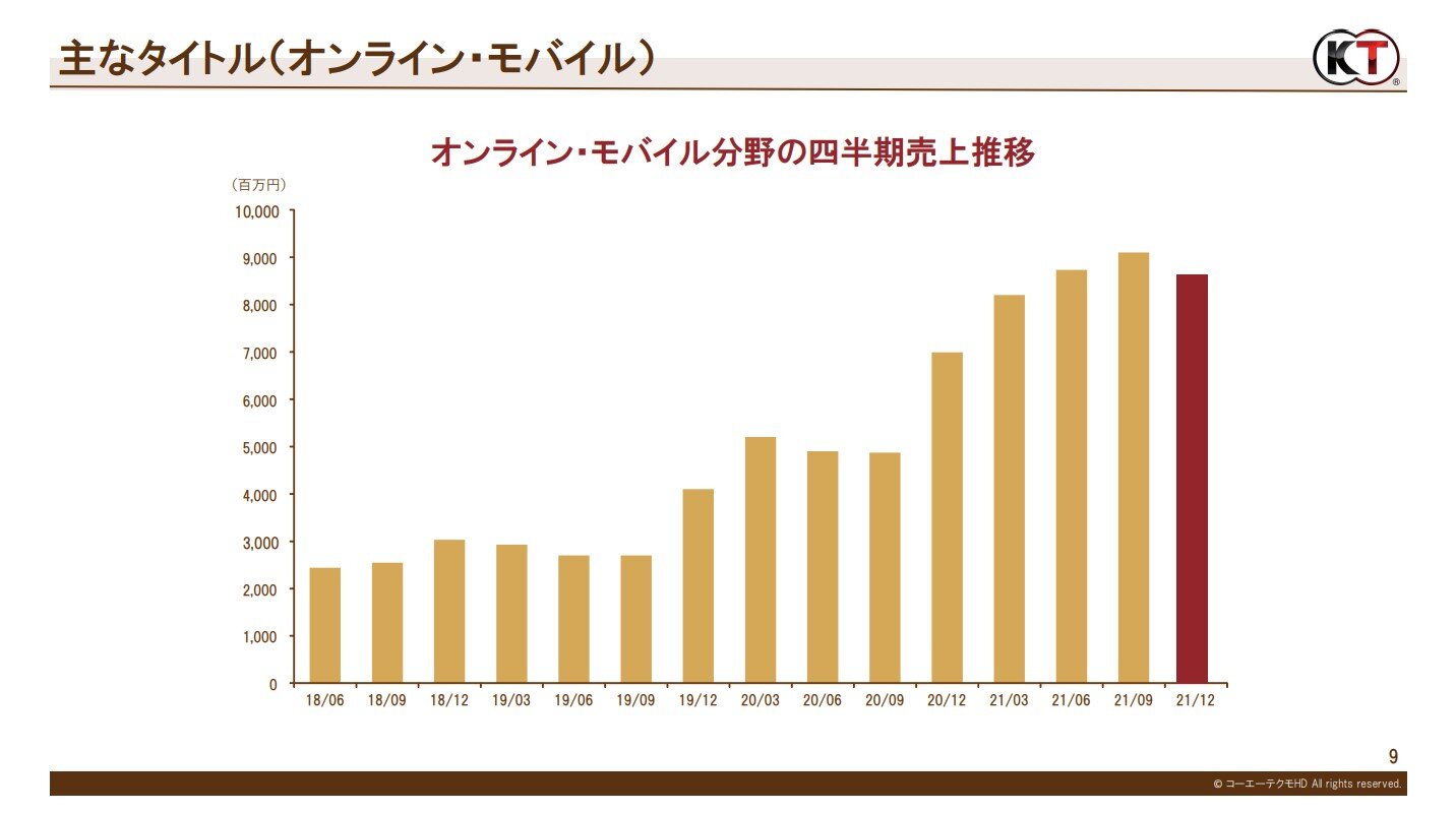 スマートフォンゲームでは、国内及びアジア各地域で配信中のIP許諾タイトル『三国志・戦略版』(国内では『三國志 真戦』)が、中国でのキャンペーンや各地域でのアップデートにより、好調を維持しています。国内及び台湾・香港・マカオ地域で配信中の自社開発スマートフォンゲーム『三國志 覇道』も、新規イベントを開始するなど各種施策に取り組み、収益に貢献しました。パッケージゲームでも、複数の新作やリマスター版を発売し、リピート販売も堅調となりました。また、金融市場が不安定な環境下においても有価証券売却益を計上し、営業外収益も高い水準となりました。以上の結果、売上高、営業利益、経常利益、四半期純利益のすべての項目で第3四半期連結累計期間として最高の業績を達成し、営業利益、経常利益、四半期純利益は2021年4月に公表した通期業績予想を上回る成績となりました。