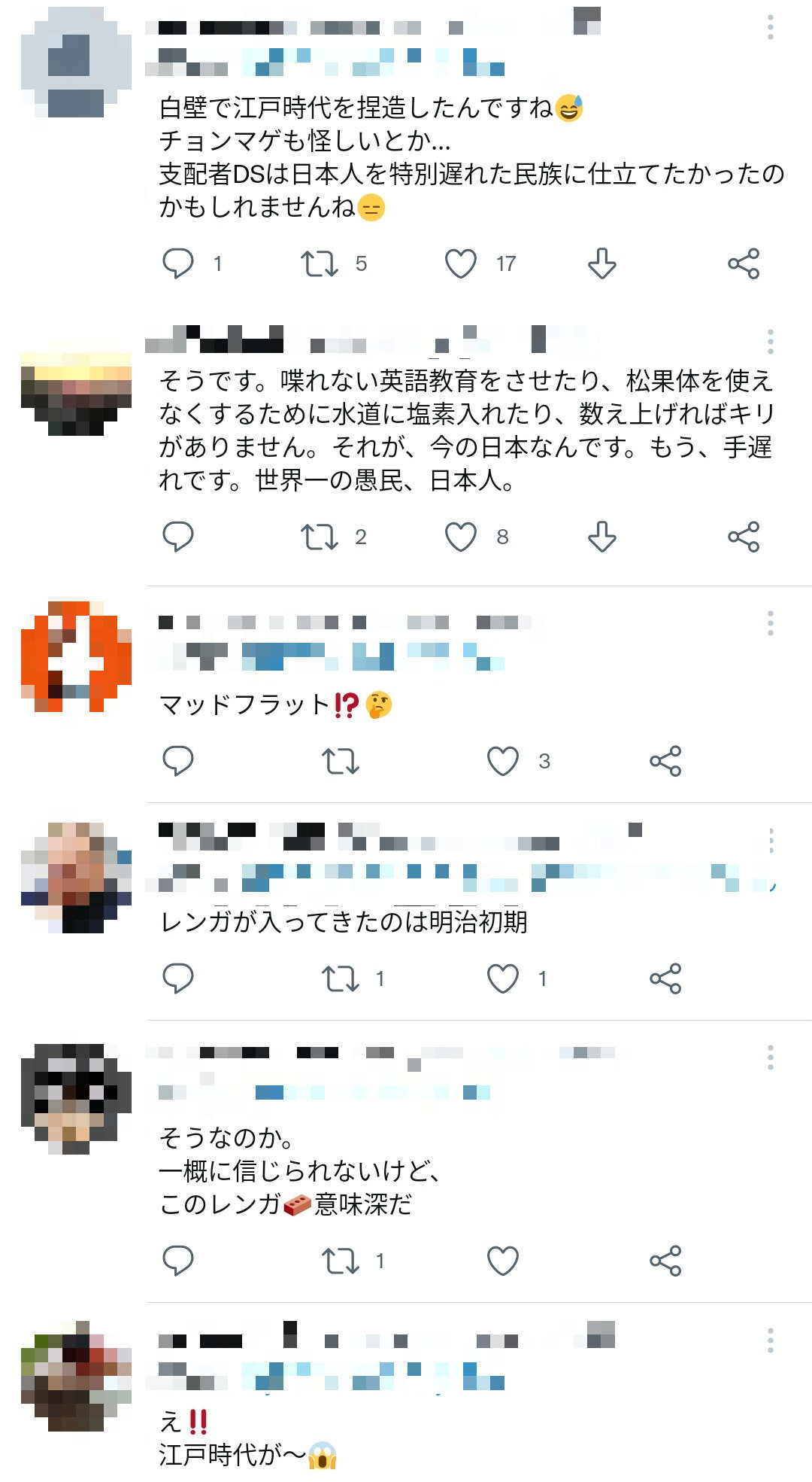 ・草。江戸時代を否定って、皇居は何の跡地にあるの?。徳川慶喜公の写真とか数々の江戸時代の絵画や書物とか、地方に代々伝わる江戸時代の文献とかどう説明するんだろ?。そもそも否定してるのホントに日本人?。
