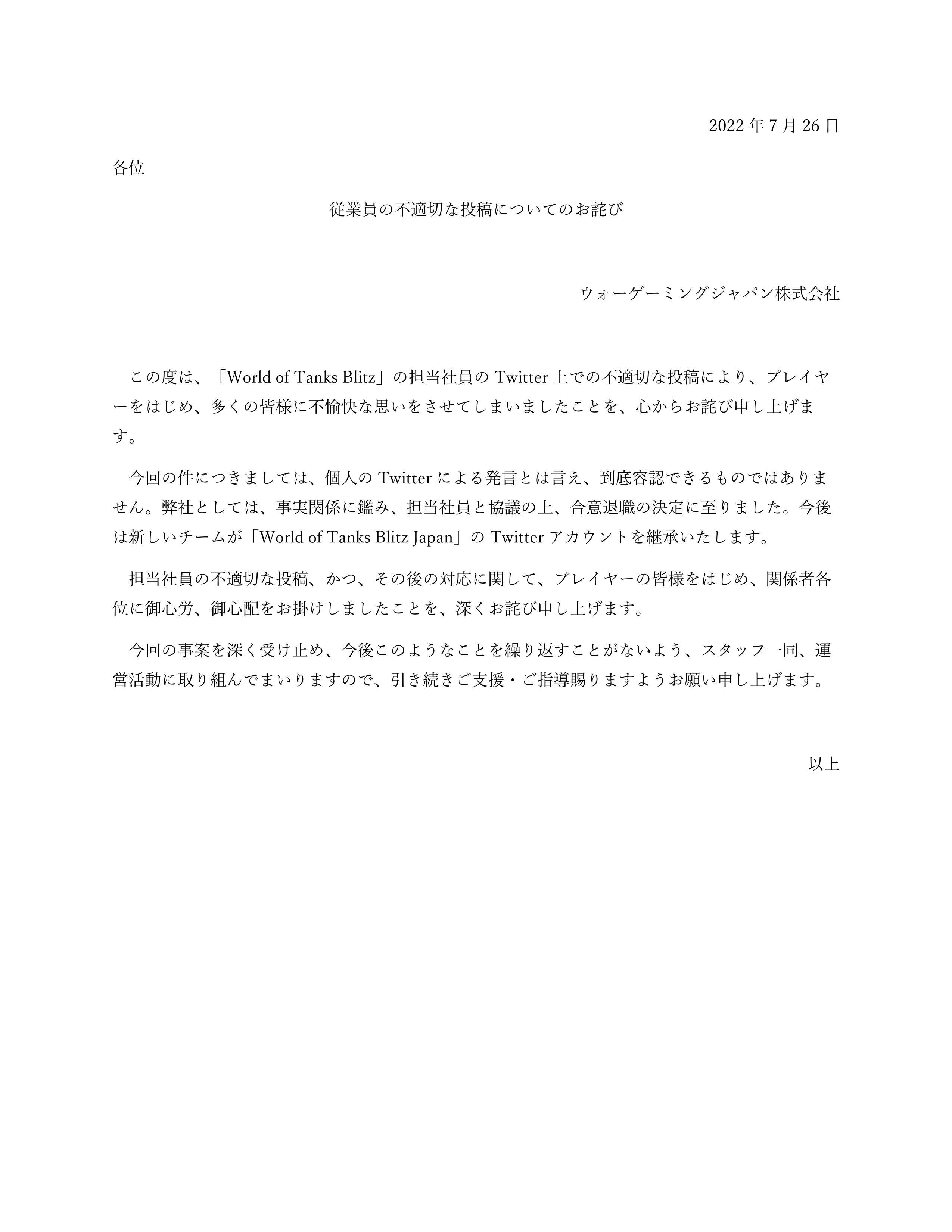・人気オンラインゲーム「World of Tanks Blitz」を展開するウォーゲーミング・ジャパンは、不適切投稿をした社員の退職が決まったと発表した。