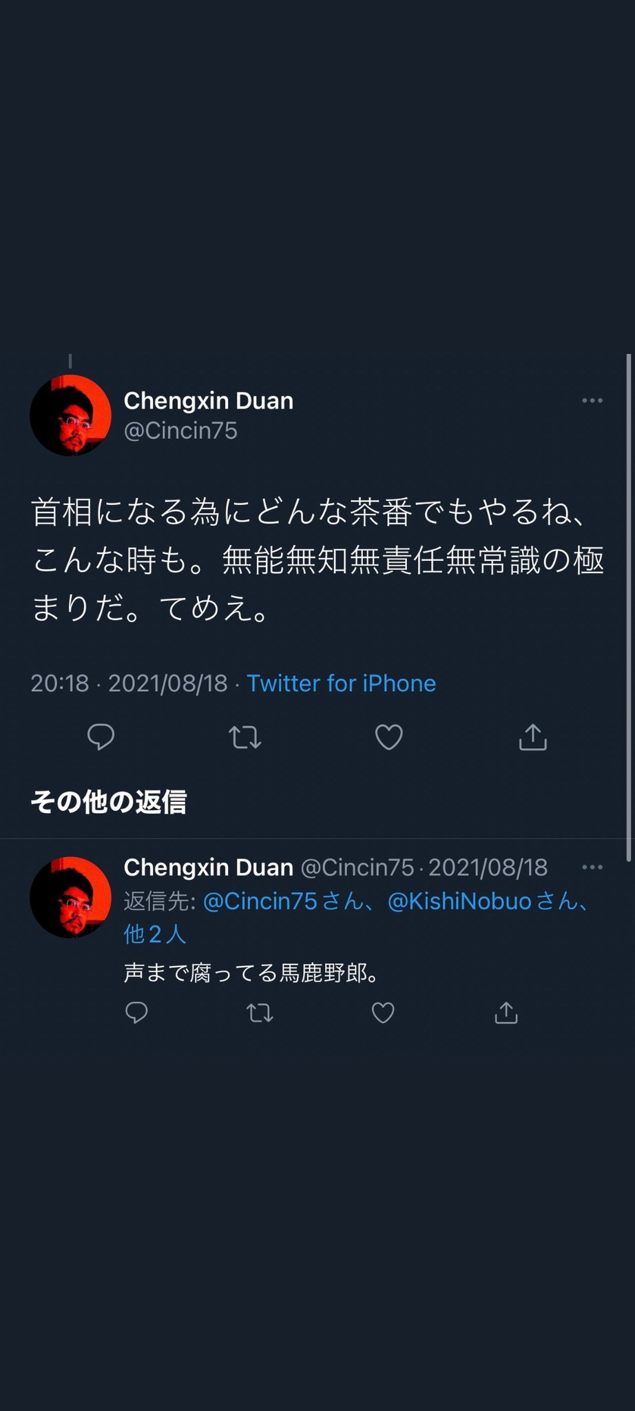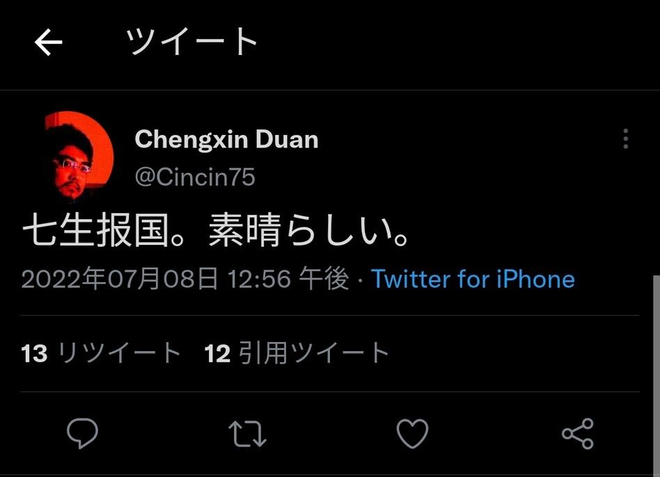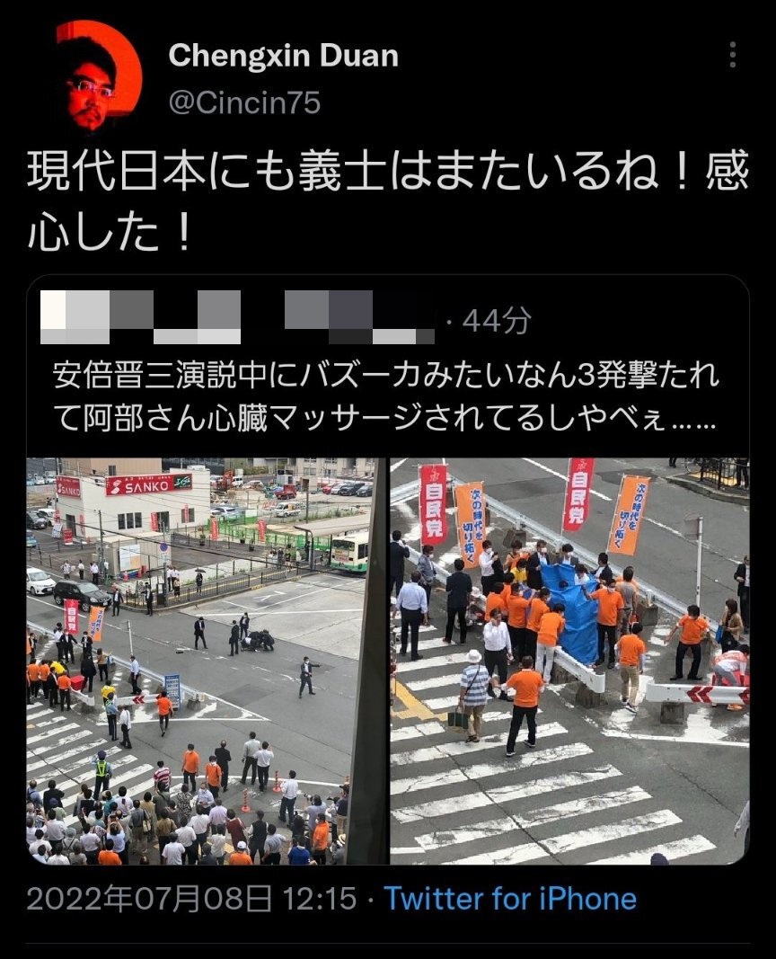 ・この人物は安倍晋三元首相が銃撃され死亡した7月8日、山上徹也容疑者が現場で取り押さえられている写真を添えた投稿を引用リツイートし、「現代日本にも義士はまたいるね!感心した!」(原文ママ)と山上容疑者を英雄視するような書き込みをしていた。