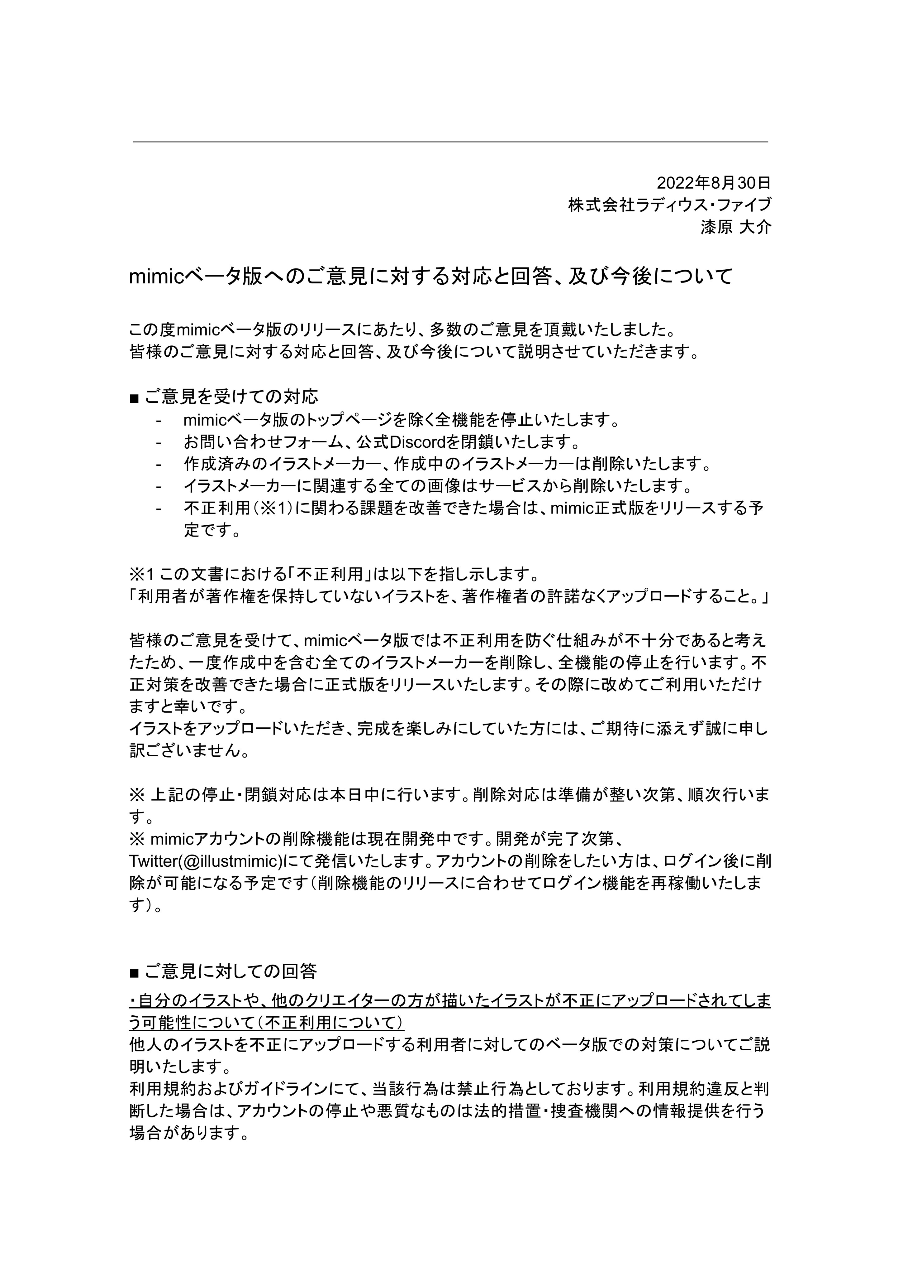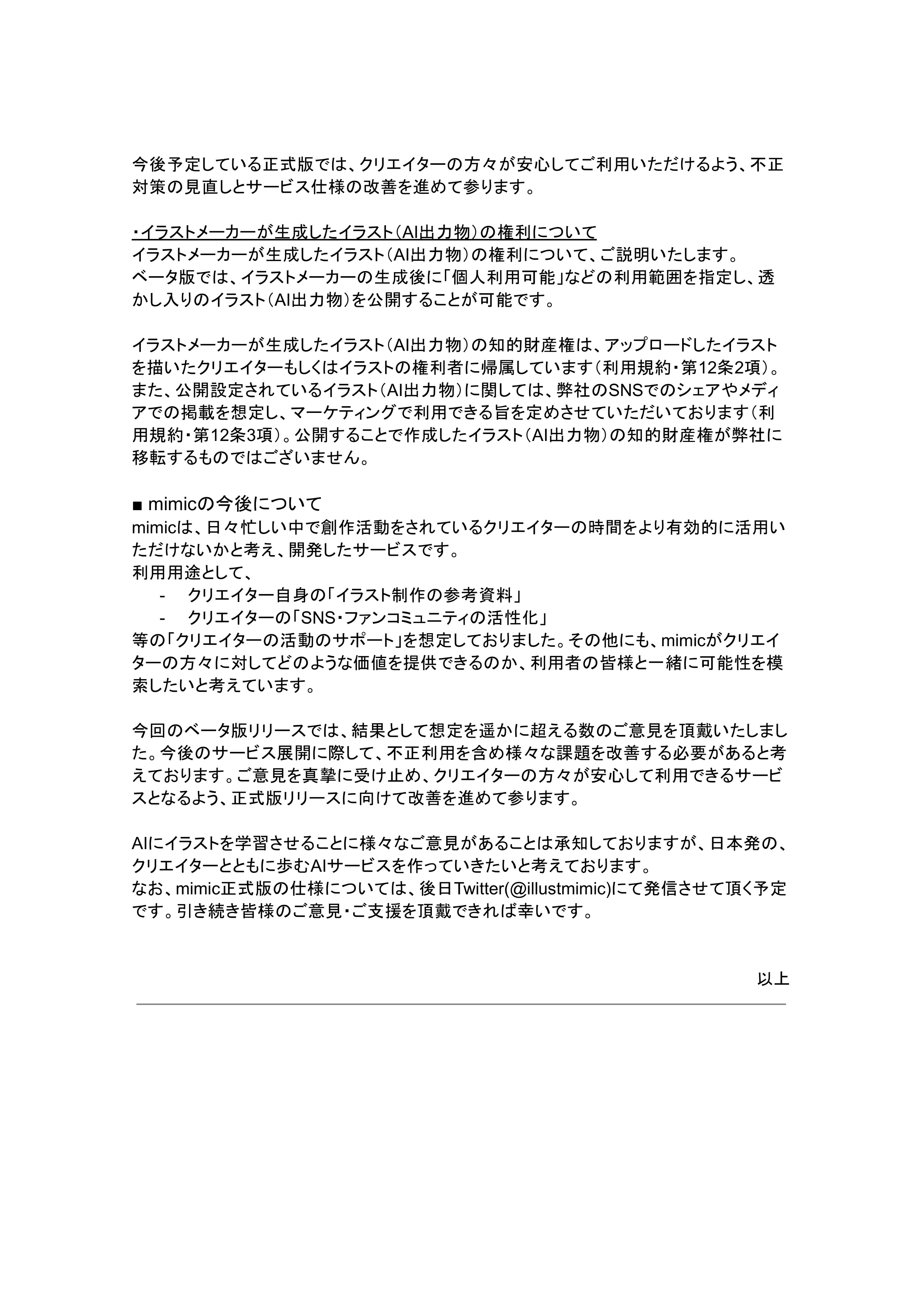 【mimicベータ版へのご意見に対する対応と回答、及び今後について】