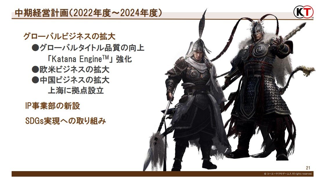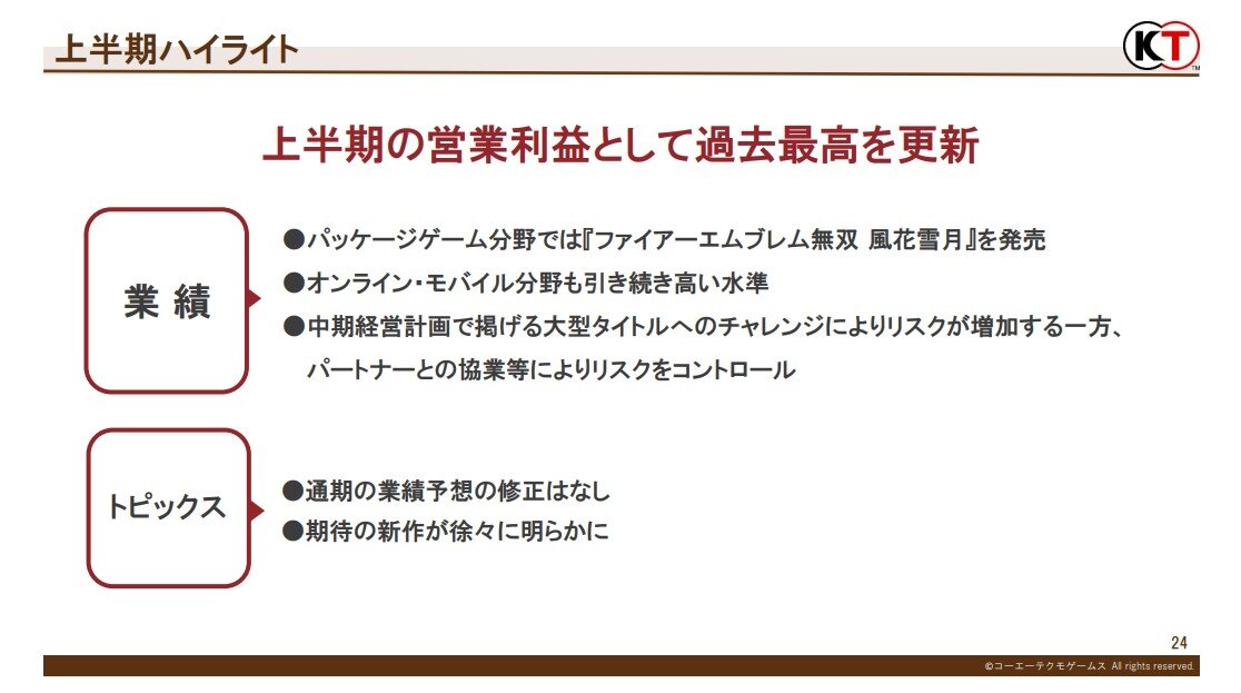 IP事業においては、国内及びアジア各地域で配信中の『三国志・戦略版』(国内では『三國志 真戦』)が、引き続き収益に貢献しました。国内及び台湾・香港・マカオ地域で配信中の『新信長の野望』も堅調です。LINE Gamesが運営を行う『大航海時代 Origin』(iOS、Android用)が8月に韓国で配信開始されました。オフィシャルショップ「KOEI TECMO SPOT」では、7月にオンライン販売を追加しました。
