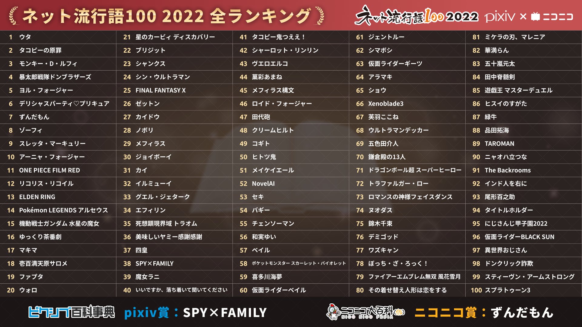 ・2018年にスタートし、今年で5回目を迎える「ネット流行語100」が今年も開催され、2022年間大賞は『ウタ(ONE PIECE FILM RED)』に決定