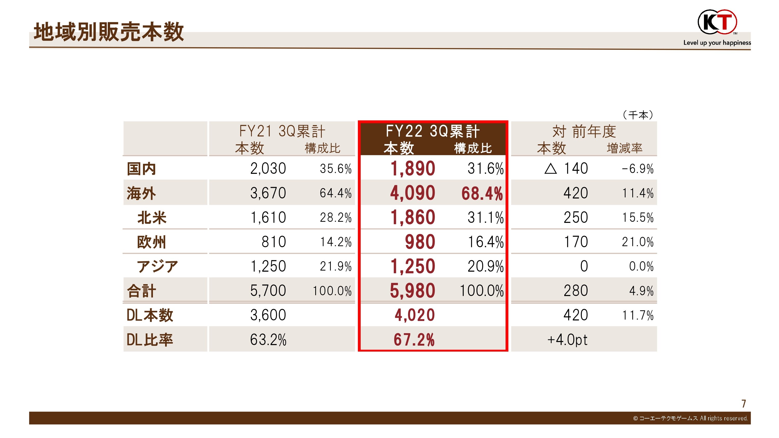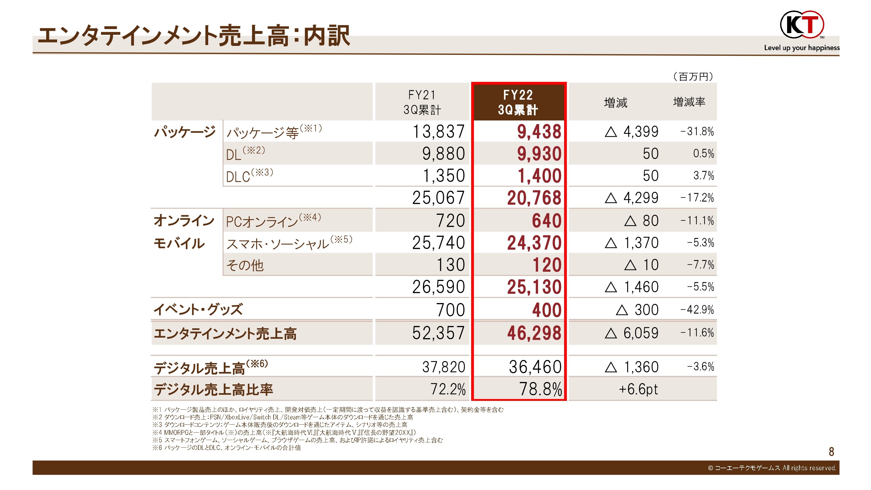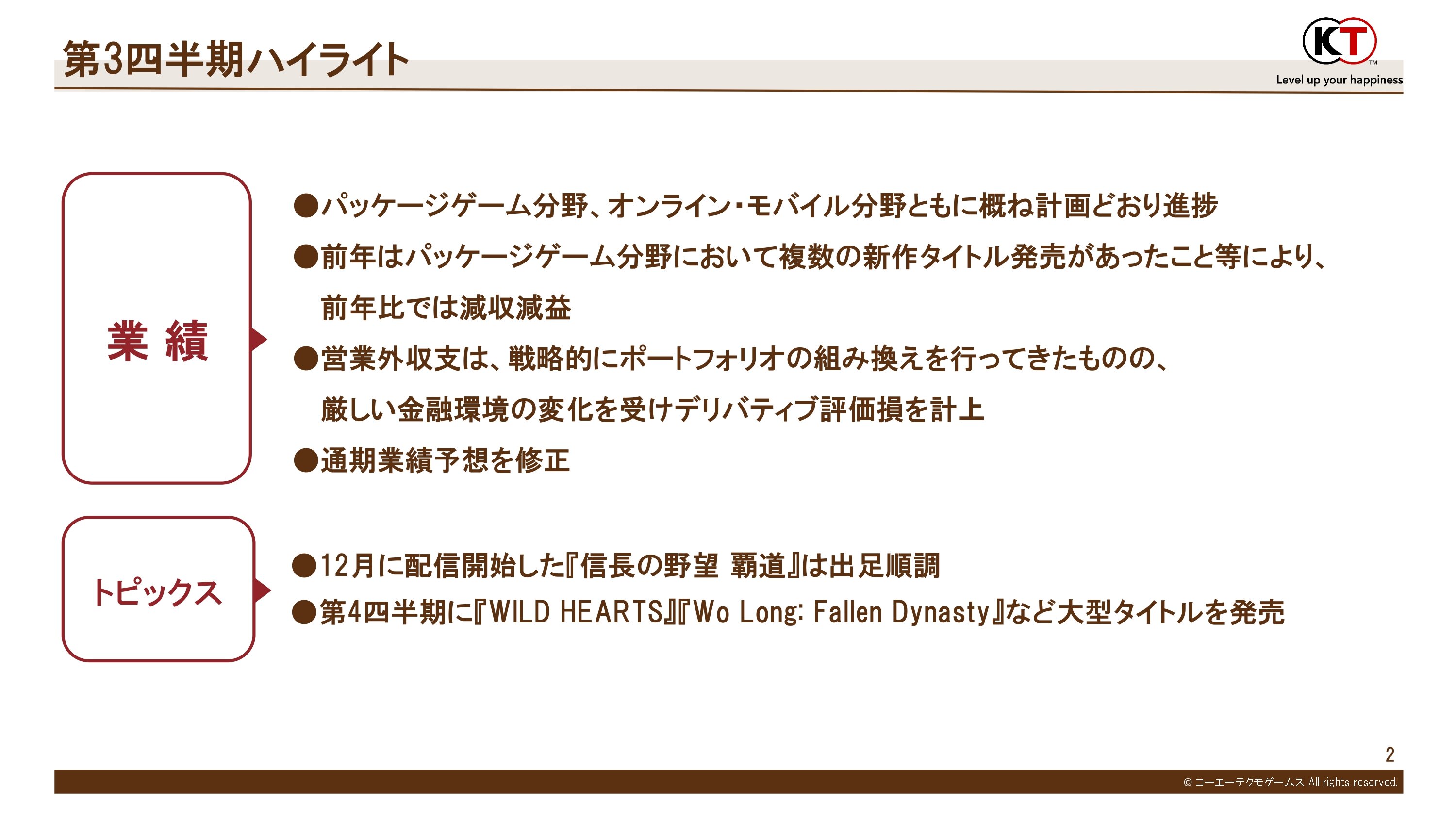 第3四半期累計では、前年度にパッケージゲーム分野において複数の新作タイトルの発売があったこと等により、前年度に比べ売上高と営業利益は減少しました。営業外収支においては、戦略的にポートフォリオの組み替えを行ってきたものの、厳しい金融環境の変化の影響を受け、デリバティブ評価損を計上しました。