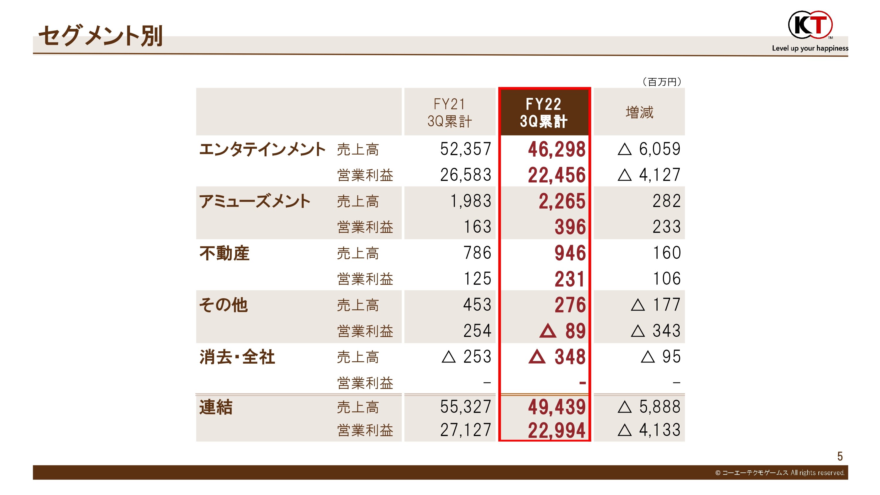 アミューズメント施設は、12月に新たに1店を出店し、店舗数は10店となりました。スロット・パチンコでは、当社が開発を担当した1タイトルが稼働を開始しました。